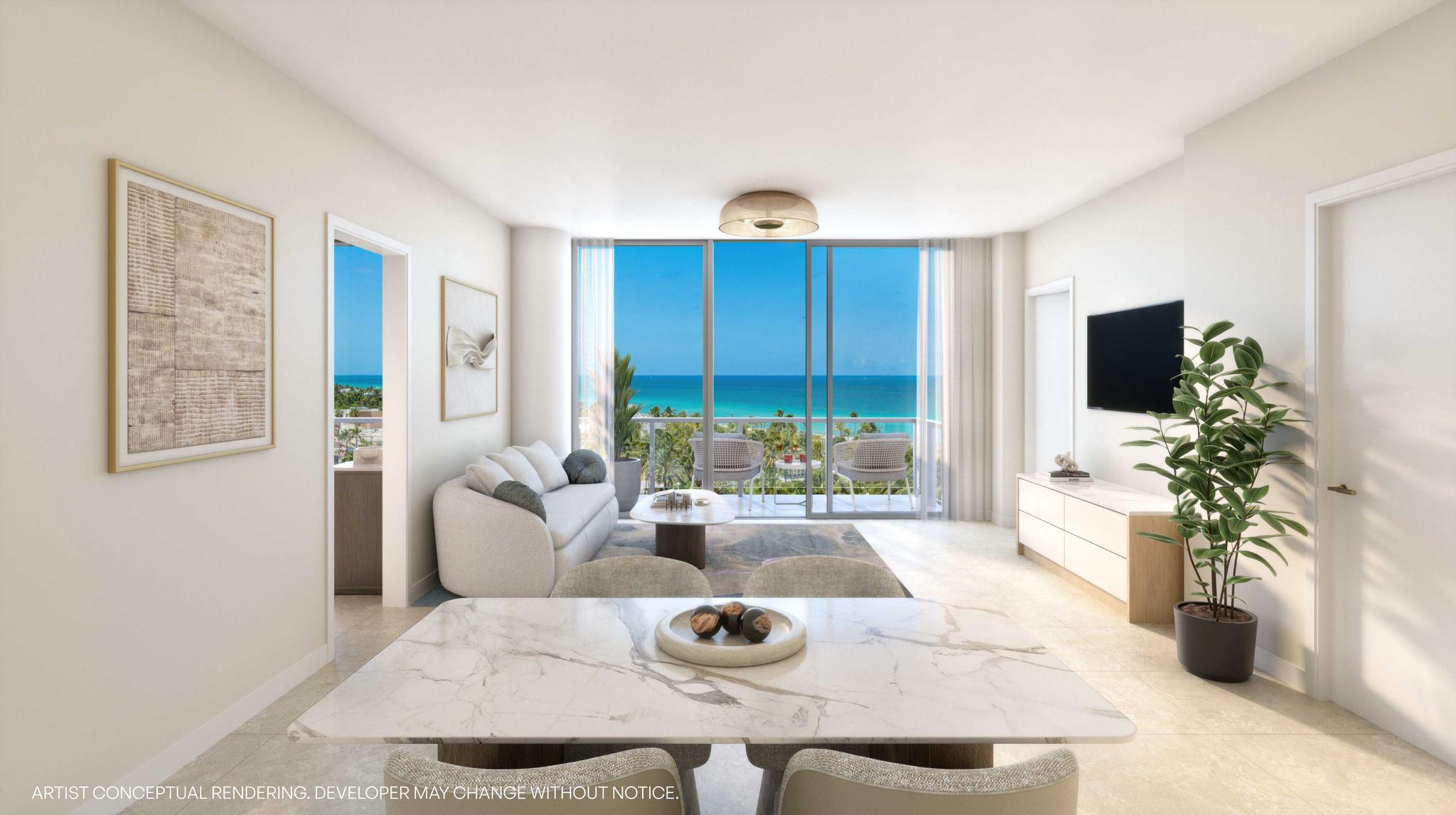 Developed by Northlink Capital and designed by the acclaimed Revuelta Architecture International, 7200 Collins is defined by its fluid lines and ocean-facing form. The building’s signature curved façade allows for panoramic views and sunlight to permeate each residence, while glass-wrapped balconies connect the indoors to the natural beauty outside. Inside, interiors by Adriana Hoyos Design Studio bring warmth and sophistication to every detail, from Italian cabinetry and glazed porcelain tile flooring to bespoke furnishings selected for modern, elevated living.